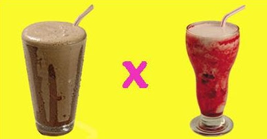1 taça de milkshake de chocolate (350,9 kcal) x 1 iogurte batido com frutas e gelo (56,4 kcal)